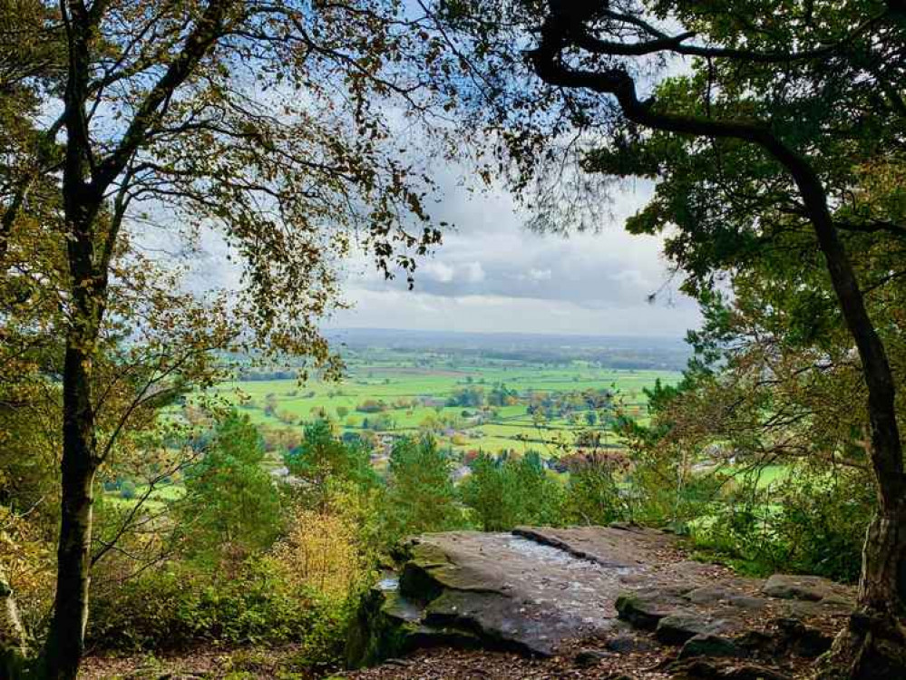 - As you near the top, you might catch snatches of fields and meandering lanes peeking through the trees. Then, suddenly, the view will open out to reveal the eastern expanses of the Cheshire Plain, reaching towards the Peak District, Cannock Chase and the Pennines.