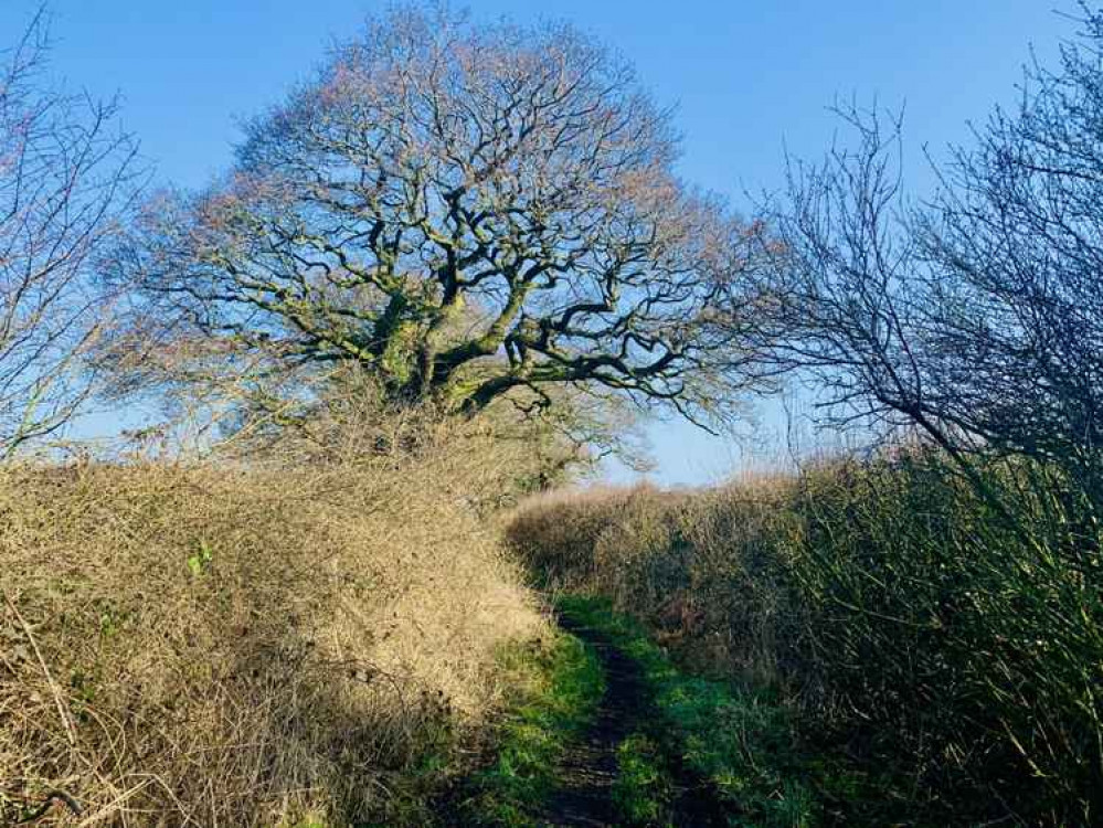 • Once you have climbed over, you will find yourself on a narrow track nestling between hedgerows. Turn left and follow it around until you reach a stile on your right.