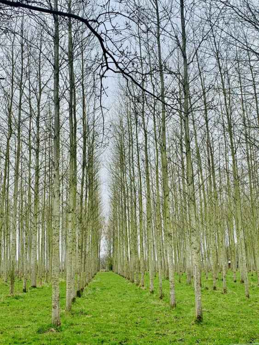 • Head up through a field and, at an old oak tree, turn left to walk towards a field full of rows of poplars.