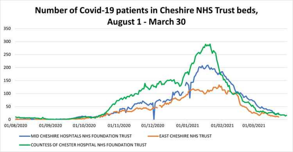 Hospitals are also becoming less and less busy — with 42 patients in the three Cheshire NHS Trusts as of March 30, compared to 54 a week earlier.