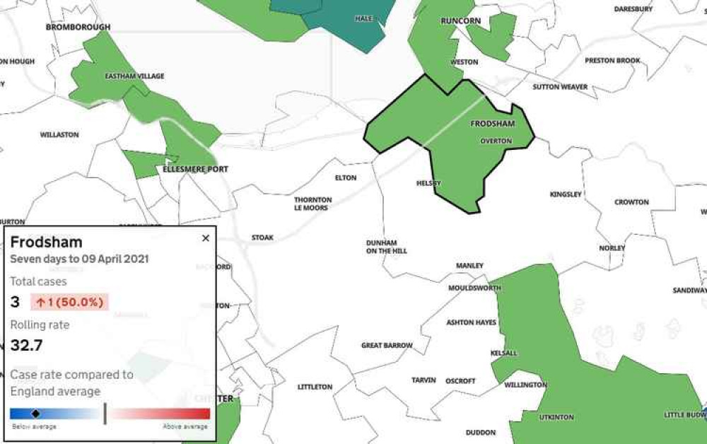 In the seven days leading up to April 9, there were three new infections recorded in Frodsham, resulting in a rate of 33 per 100,000 people. This marked a very slight increase on the previous week.