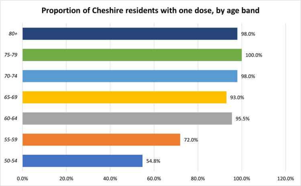 Nearly nine in ten of Cheshire's over-50 population have had their first dose of a Covid-19 vaccine, new data shows.